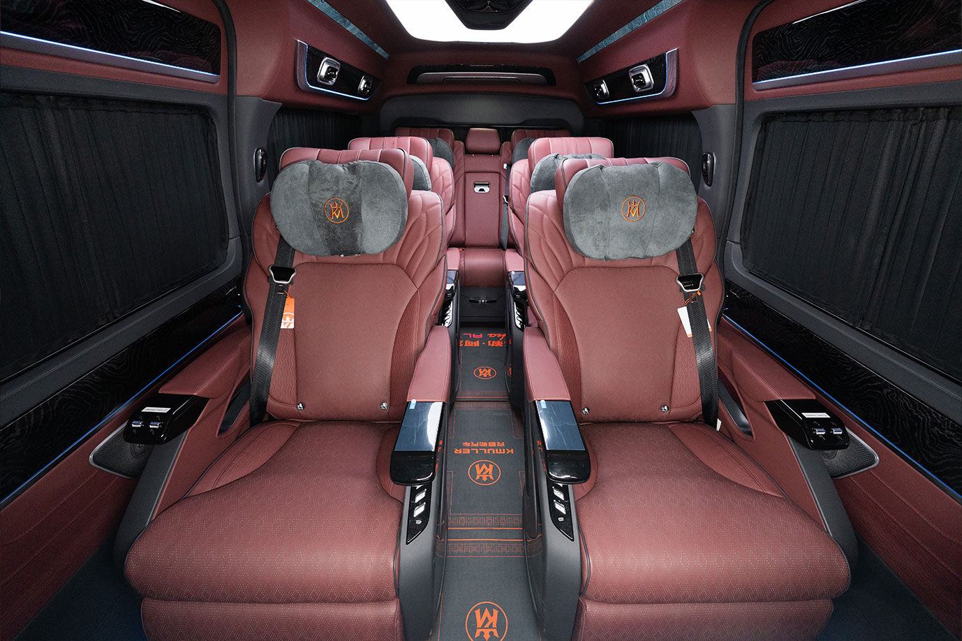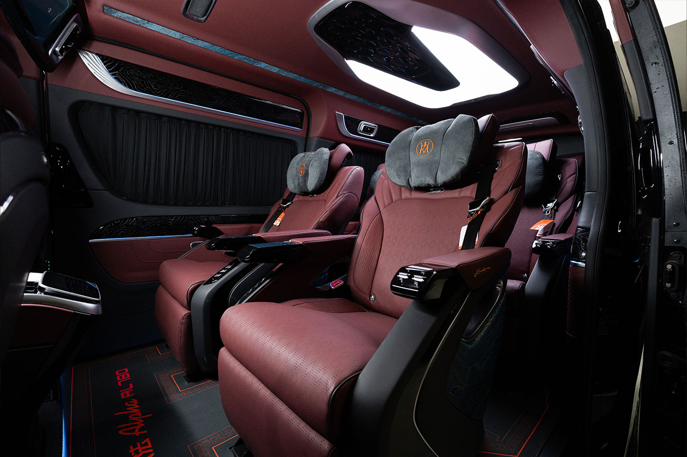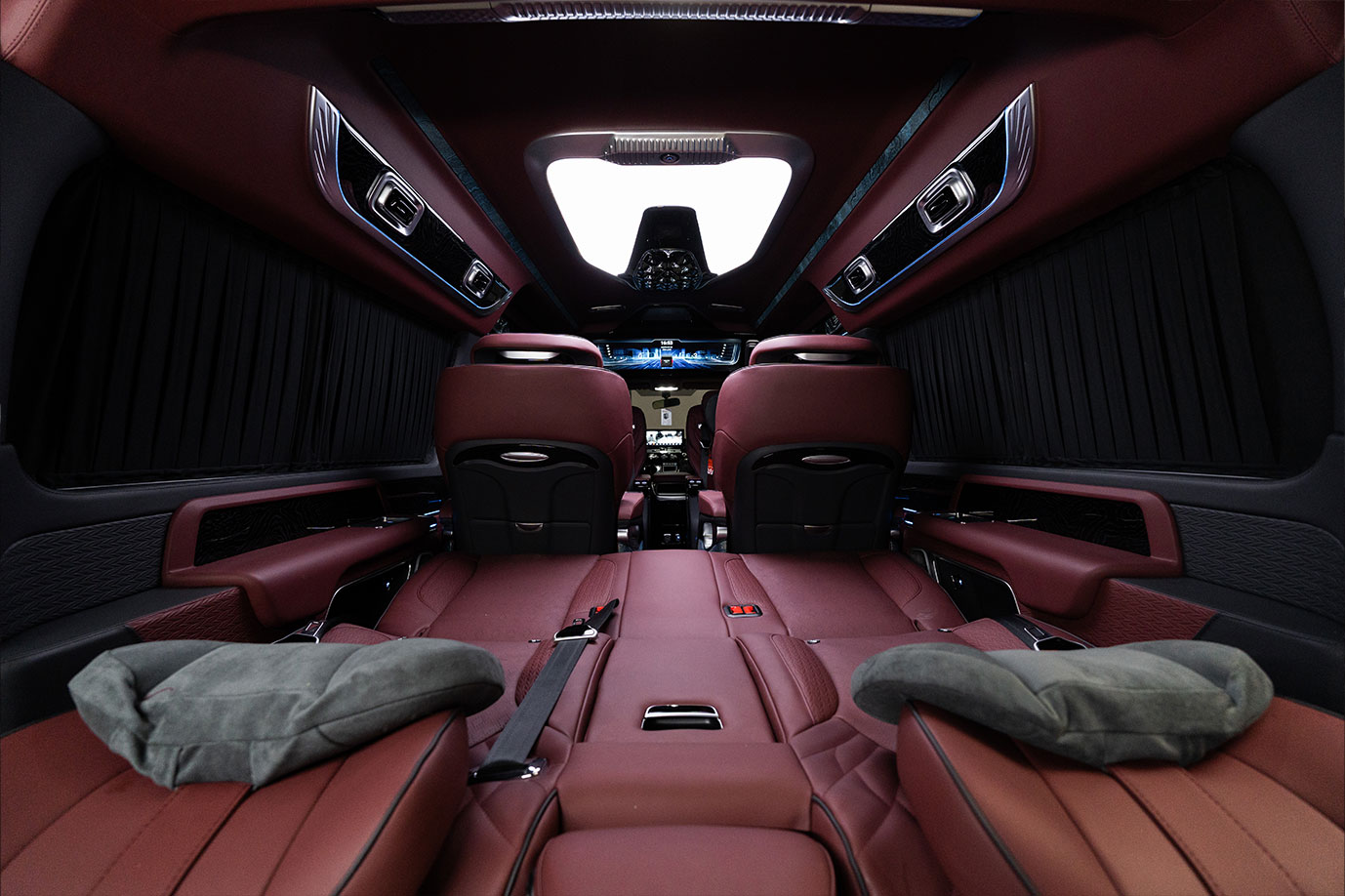 后排一体式沙发床椅,带可收起中控扶手,带通风、加热等功能;后舱38寸弧面娱乐系统大屏,可旋转180°航空座椅;